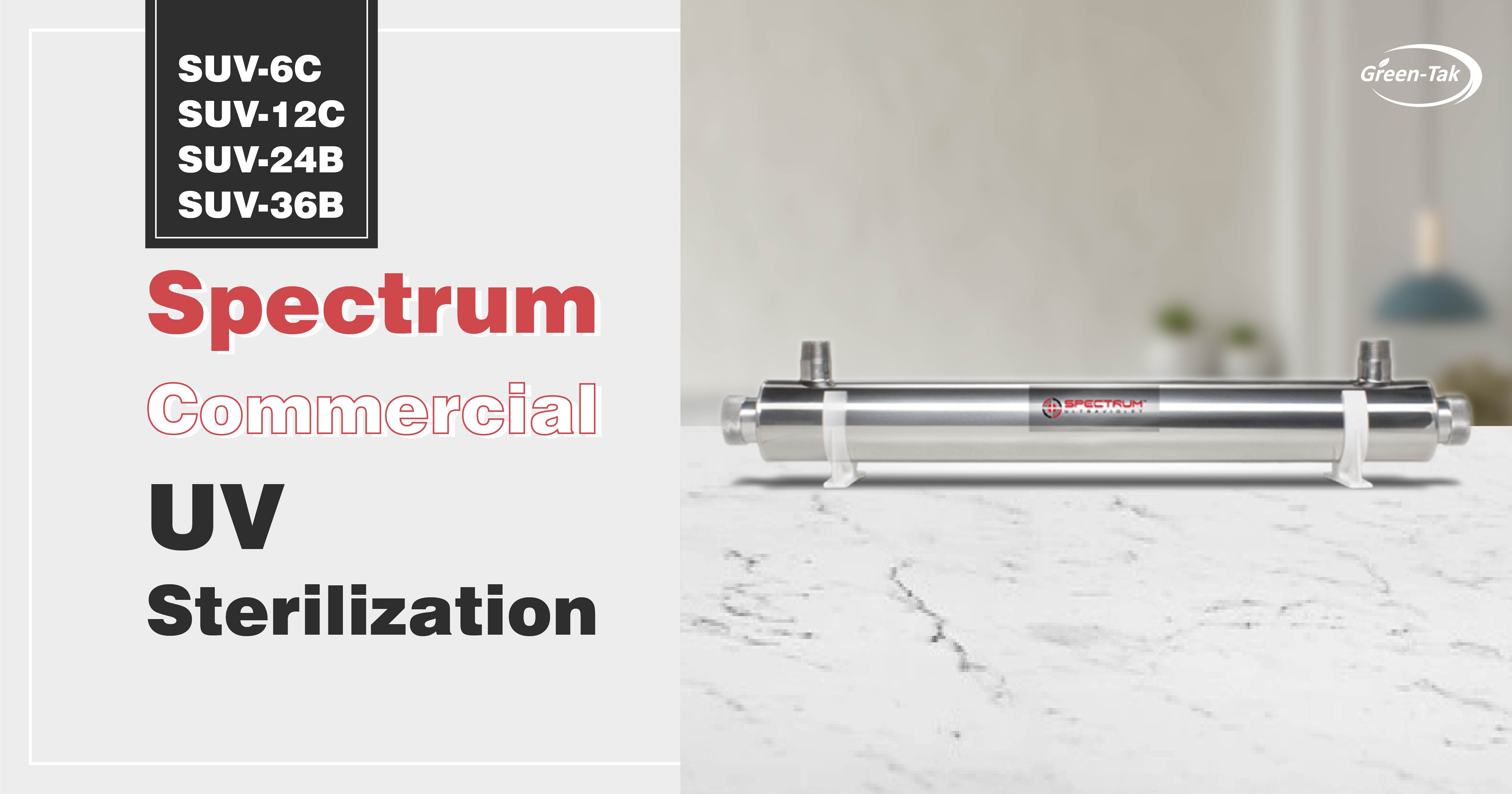 La esterilización UV comercial de Spectrum está verificada por las certificaciones UL y CE, tiene una construcción duradera, una funda de cuarzo de alta calidad y lámparas UV de alto rendimiento, y es capaz de matar bacterias hasta en un 99,9% con un flujo estándar. La esterilización ultravioleta Spectrum es la mejor opción y la más económica en esterilización UV para tratamiento de agua comercial para aplicaciones de flujo medio y bajo, tales como: sistemas de ósmosis inversa comerciales ligeros, máquinas expendedoras de agua y laboratorio.