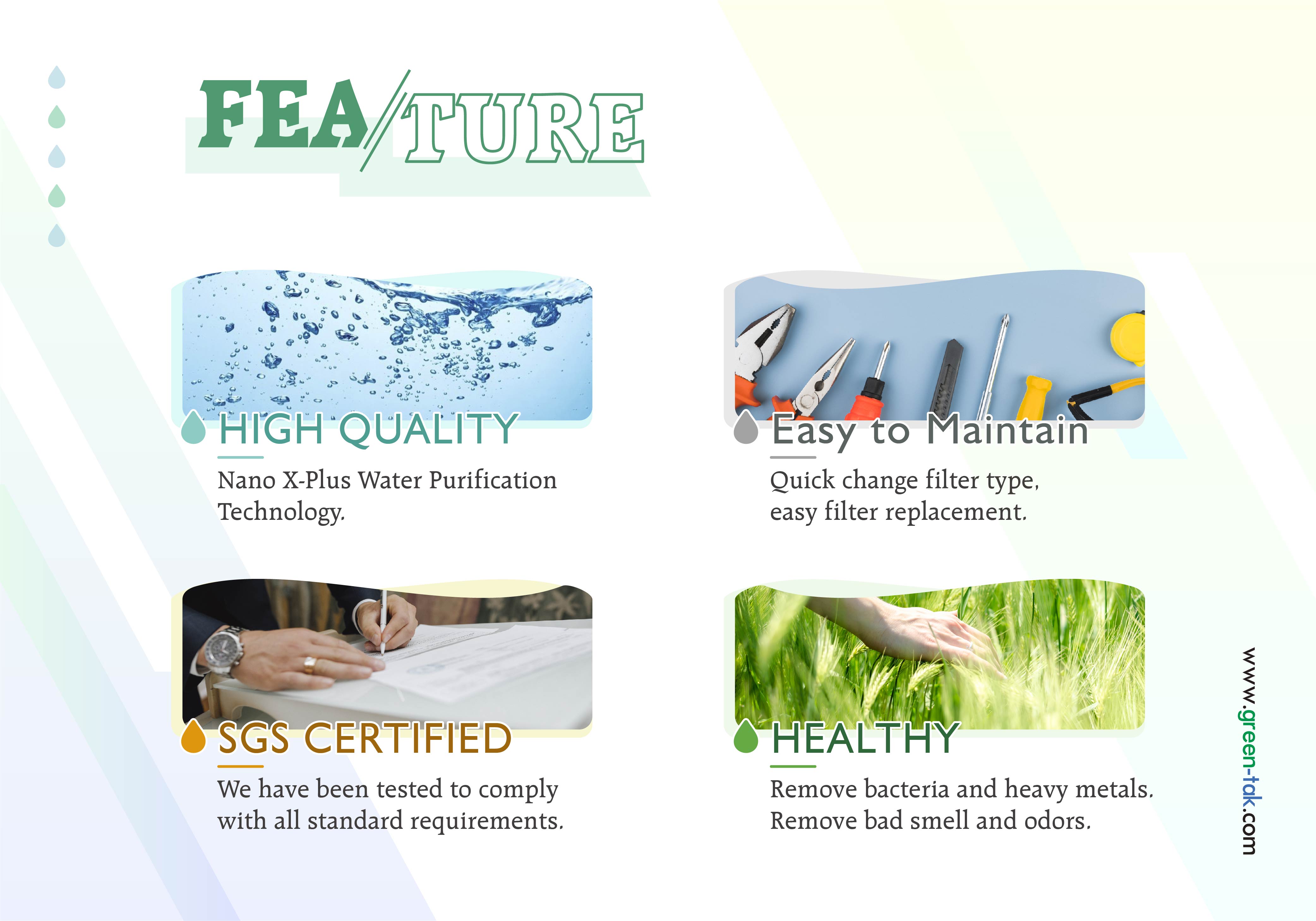 El purificador de agua dual nano es una revolución de la purificación de agua. Mediante el uso de la exclusiva tecnología de purificación de agua nano x-plus patentada, el purificador de agua puede eliminar bacterias y metales pesados hasta en un 99% y retener minerales en el agua. El filtro NANO ha sido probado y certificado por SGS, la empresa líder mundial en inspección, verificación, pruebas y certificación.