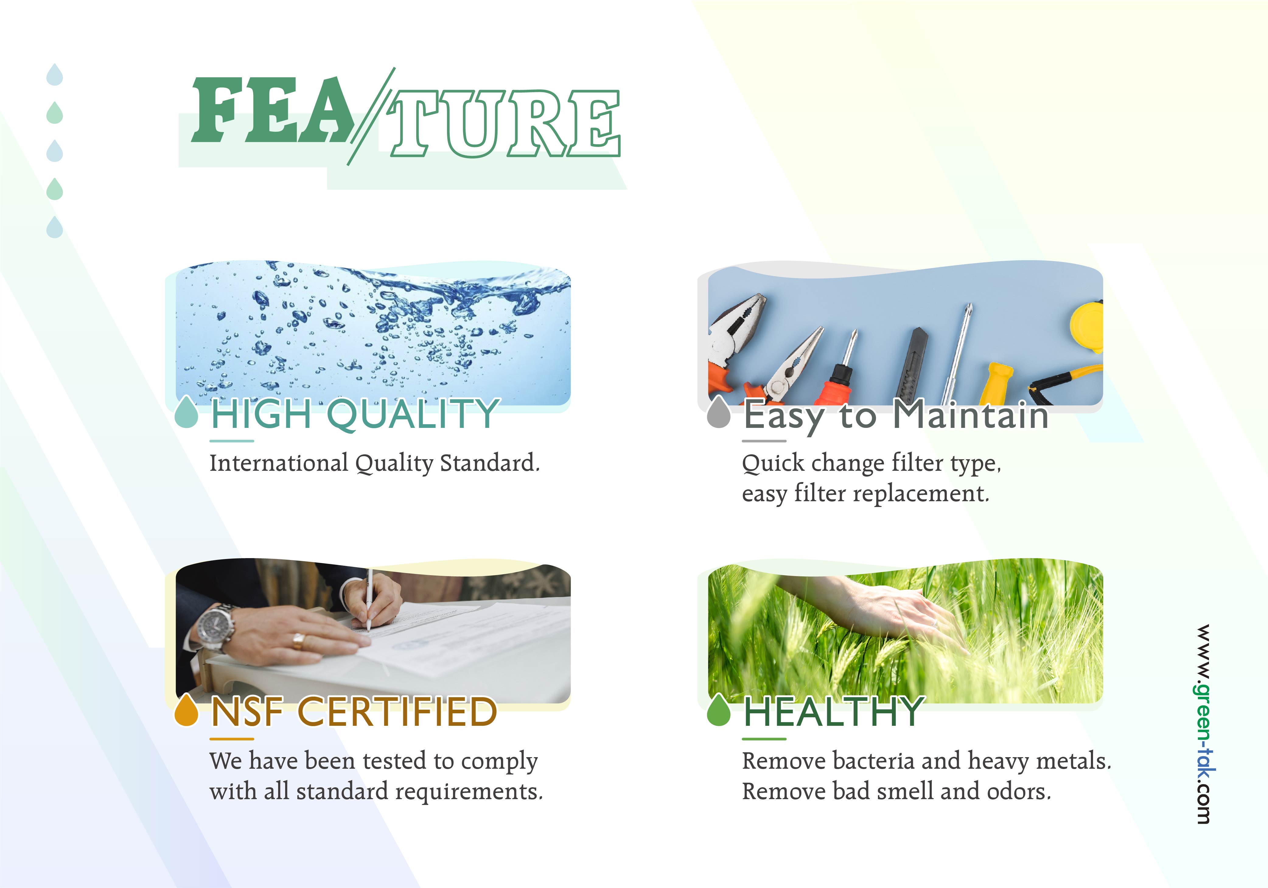 Green-Tak presenta un nano purificador de agua ecológico sin electricidad y un diseño con cartuchos de filtro de agua de cambiador rápido, y es una opción perfecta para el sistema de agua potable doméstico.